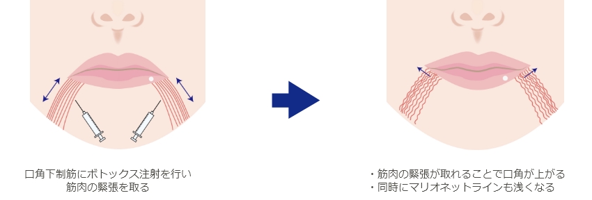 美容医療ではこの口角下制筋に、筋肉を緩める作用のあるボトックスを注入することで対応しています。